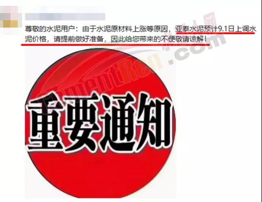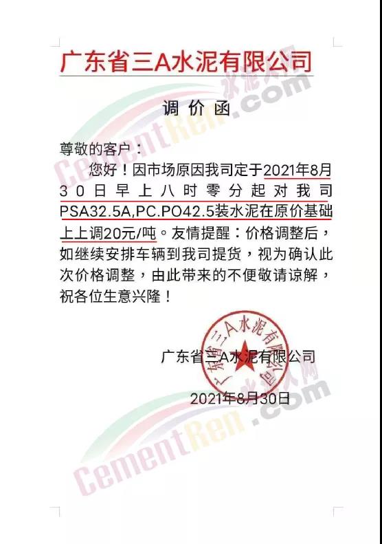 同期,廣東省三A水泥有限公司通知,因市場(chǎng)原因公司定于2021年8月30日早上八時(shí)零分起對(duì)公司PSA32.5A,PC42.5、PO42.5裝裝水泥在原價(jià)基礎(chǔ)上上調(diào)20元/噸。