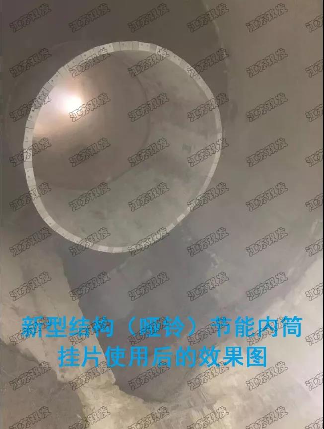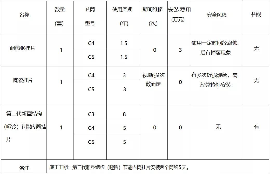 3、第二代新型結(jié)構(gòu)(啞鈴)節(jié)能內(nèi)筒掛片:采用金屬陶瓷構(gòu)架,經(jīng)內(nèi)外特種澆注料壓制及1400℃高溫?zé)贫?,正常使用情況下 C4、C5 內(nèi)筒質(zhì)保五年,C4實(shí)際壽命大于七年、C5實(shí)際壽命大于六年以上期間無需任何維修,具有密封性能好、耐磨性能強(qiáng)、耐高溫、耐腐蝕,且抗沖擊能力強(qiáng)、降低負(fù)壓有明顯的效果。