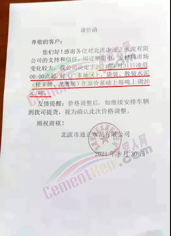 北流市通正水泥有限公司通知稱,因近期限電,原材料市場(chǎng)變化較大,公司決定于2021年8月31日凌晨0時(shí)起,對(duì)(廣東地區(qū)),袋裝、散裝水泥(桂豐牌,龍鷹牌)在原價(jià)基礎(chǔ)上上調(diào)20元/噸。