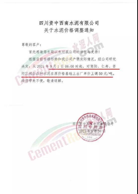 四川資中西南水泥有限公司通知根據(jù)目前市場(chǎng)形勢(shì)和公司產(chǎn)銷實(shí)際情況,經(jīng)公司研究決定,從9月1日8時(shí)起,對(duì)簡(jiǎn)陽、仁壽、資陽區(qū)域各品種水泥在原價(jià)格基礎(chǔ)上出廠單價(jià)上調(diào)50元/噸。