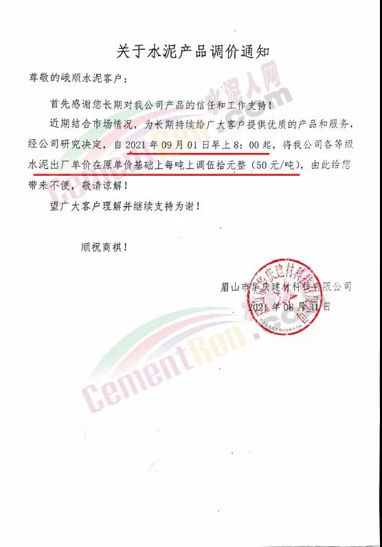 眉山市華慶建材科技有限公司通知結(jié)合市場(chǎng)情況,為長(zhǎng)期持續(xù)給廣大客戶提供優(yōu)質(zhì)的產(chǎn)品和服務(wù),經(jīng)公司研究決定,自2021年9月1日8時(shí)起,將公司各等級(jí)水泥出廠單價(jià)在原單價(jià)基礎(chǔ)上上調(diào)50元/噸。