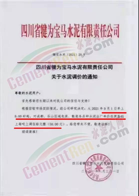 四川省犍為寶馬水泥有限責(zé)任公司通知,自9月1日早8時(shí)起,對(duì)成都、樂山區(qū)域包裝、散裝水泥出廠單價(jià)在原基礎(chǔ)上上調(diào)50元/噸。