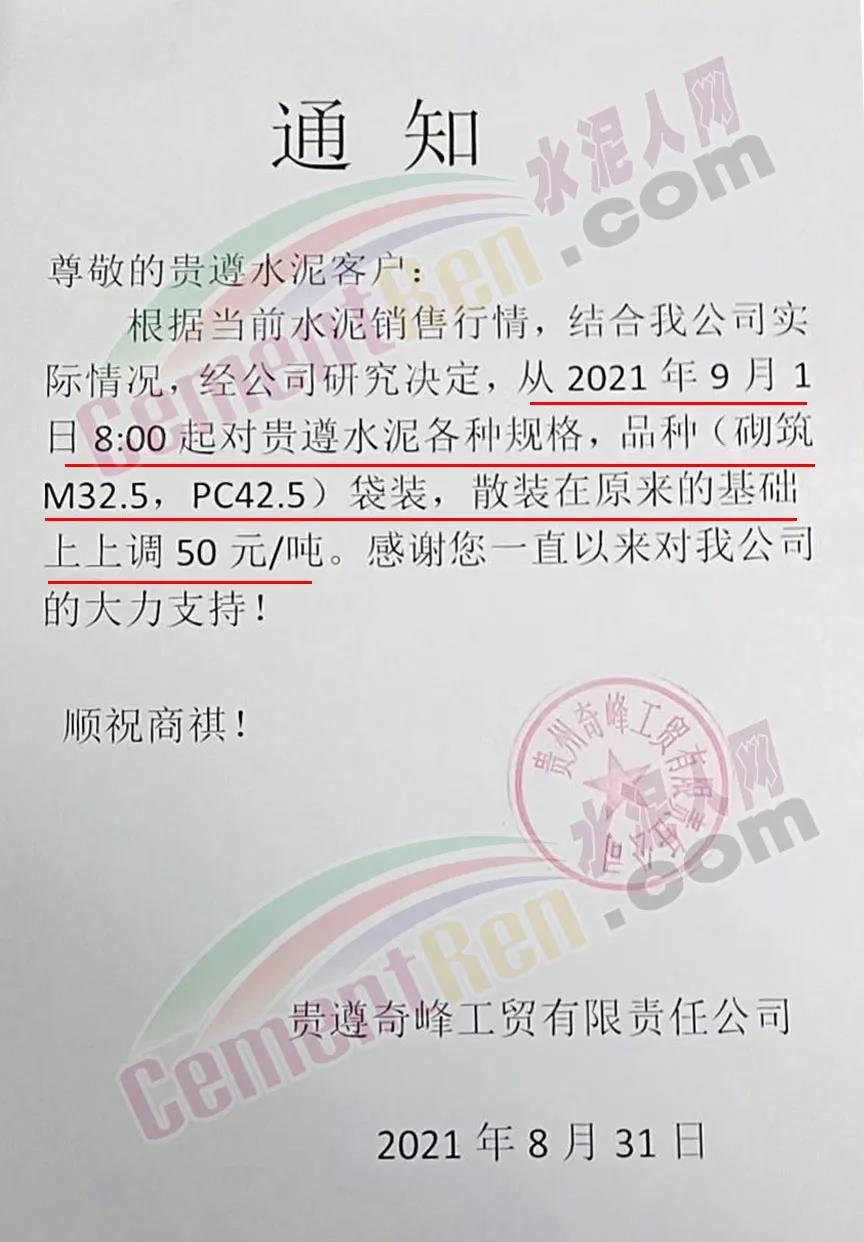 貴遵奇峰工貿(mào)有限責(zé)任公司通知,根據(jù)當(dāng)前水泥銷售行情,結(jié)合公司實(shí)際情 況,經(jīng)公司研究決定,從2021年9月1日8時(shí)起對(duì)貴遵水泥各規(guī)格品種(砌筑M32.5、PC42.5)袋裝、散裝在原來的基礎(chǔ)上上調(diào)50元/噸。