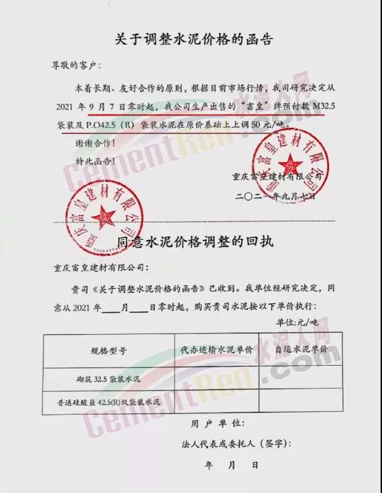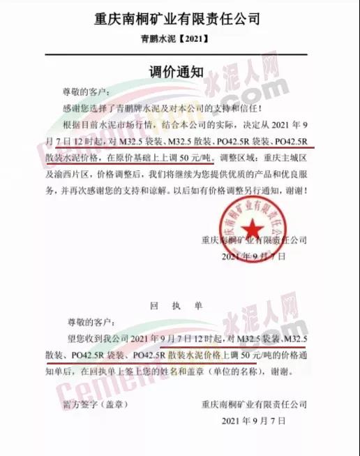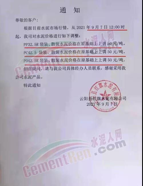 9月5日華潤(rùn)水泥對(duì)發(fā)往南寧北區(qū)域以及平南方向各品種水泥價(jià)格上調(diào)50元/噸。