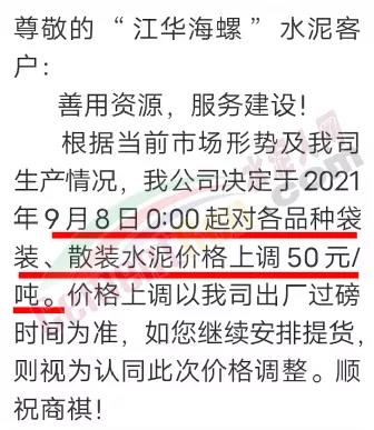 湖南江華海螺通知根據(jù)當(dāng)前市場(chǎng)形勢(shì)及公司生產(chǎn)情況,決定于9月8日0時(shí)起對(duì)各品種袋裝、散裝水泥價(jià)格上調(diào)50元/噸。
