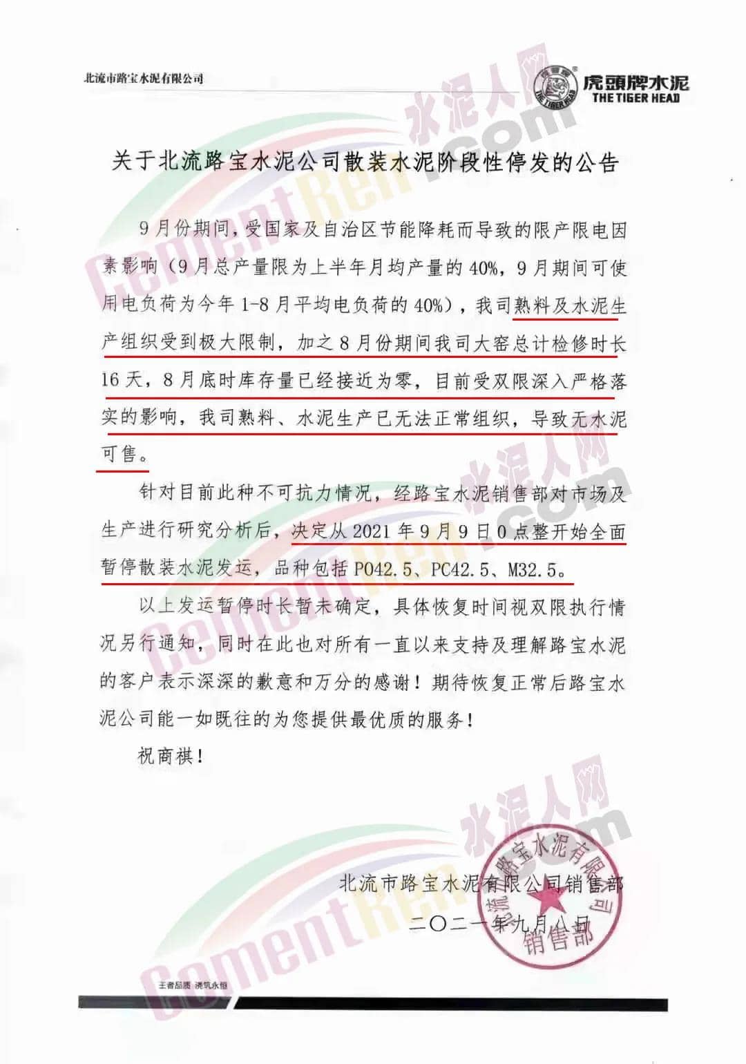 廣西北流路寶水泥公司通知,9月份期間受?chē)?guó)家及自治區(qū)節(jié)能降耗而導(dǎo)致的限產(chǎn)限電因素影響公司熟料及水泥生產(chǎn)組織受到極大限制,加之8月份期間公司大窯總計(jì)檢修時(shí)長(zhǎng)16天,8月底時(shí)庫(kù)存量已經(jīng)接近為零,目前受雙限深入嚴(yán)格落實(shí)的影響,公司熟料、水泥生產(chǎn)已無(wú)法正常組織,導(dǎo)致無(wú)水泥可售。