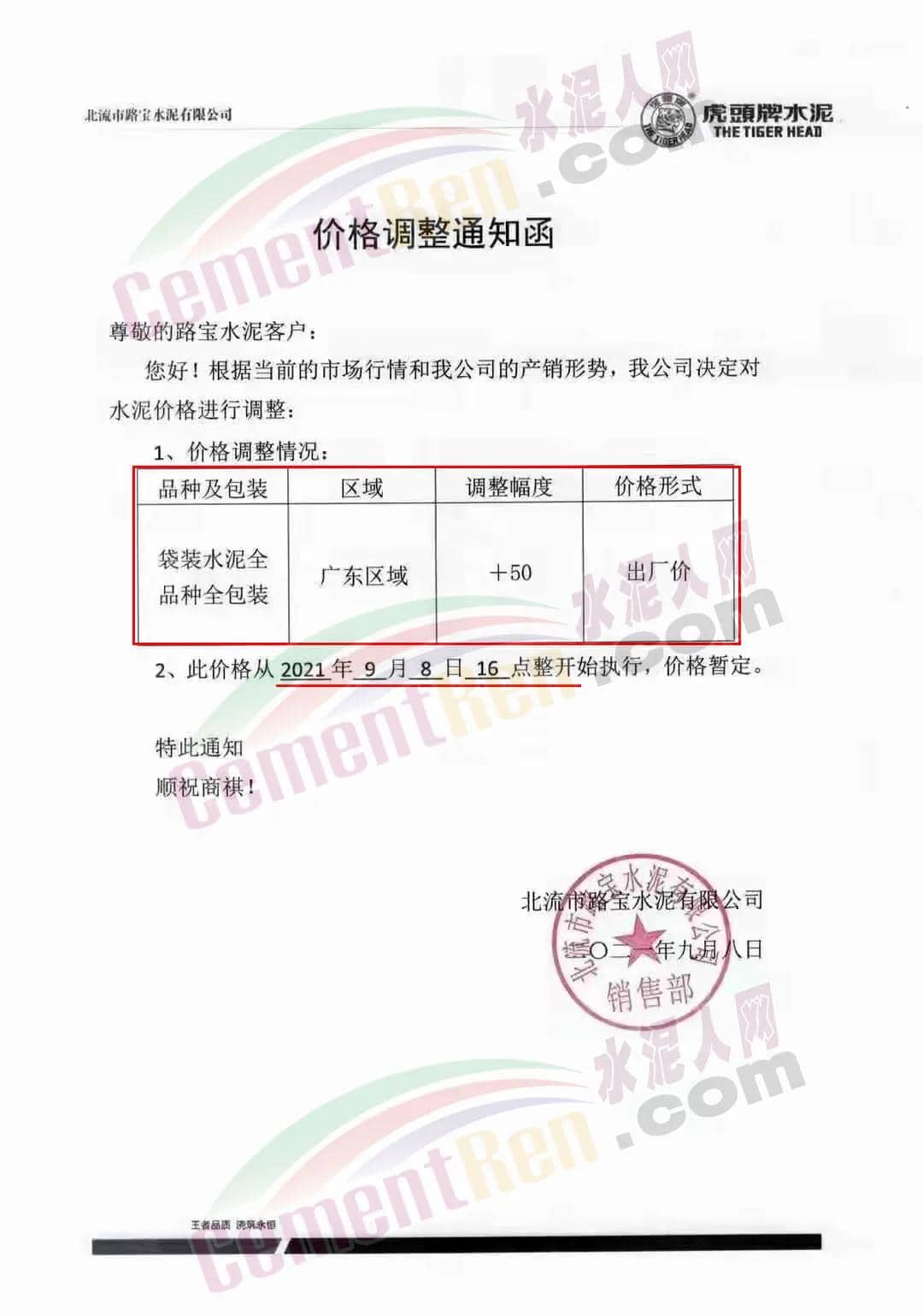 同日(9月8日)北流市路寶水泥有限公司通知,發(fā)運(yùn)廣東區(qū)域袋裝水泥全品種上調(diào)50元/噸。