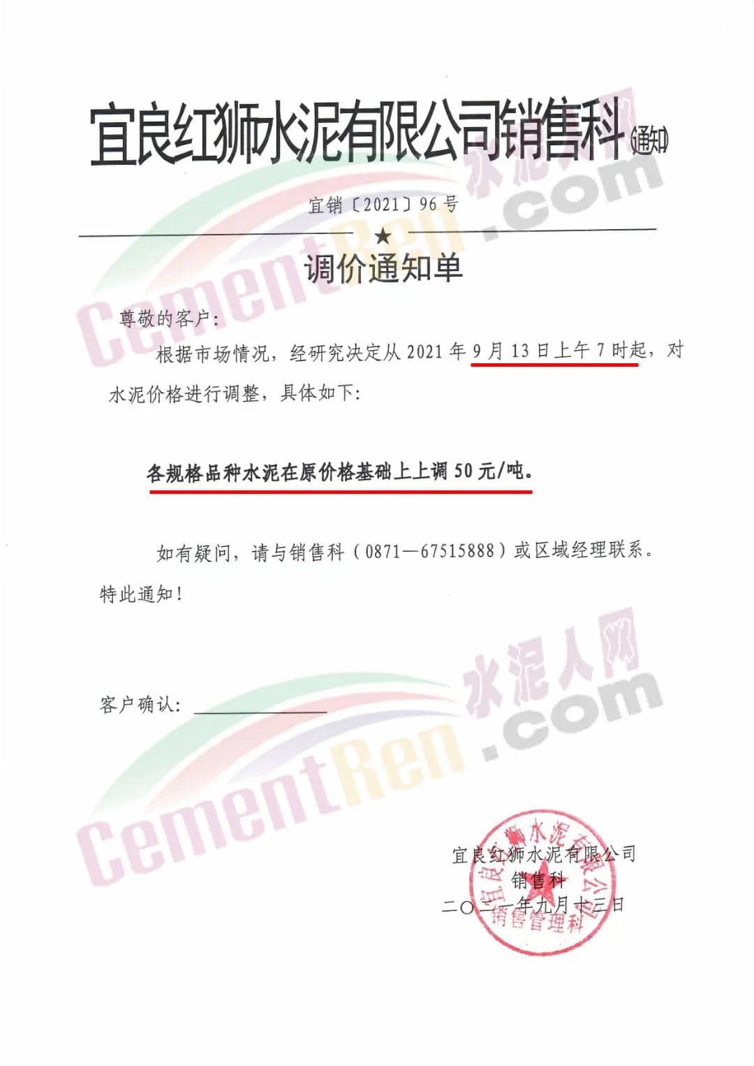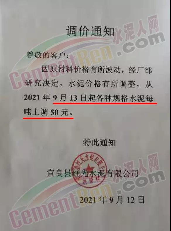 宜良紅獅水泥有限公司通知自9月13日上午7時(shí)起,上調(diào)各規(guī)格品種水泥價(jià)格50元/噸。