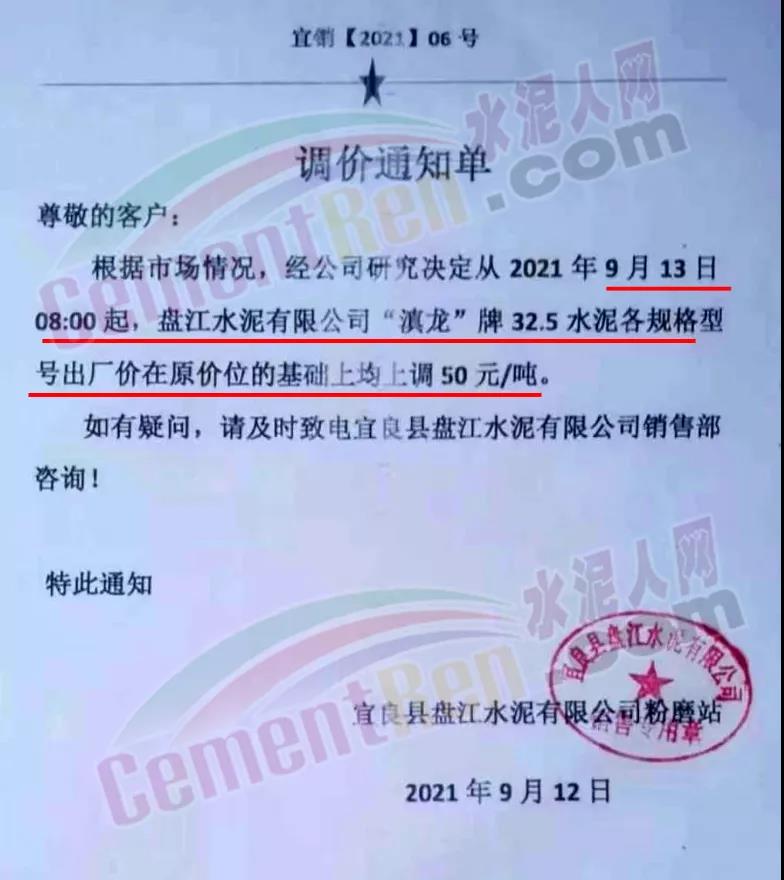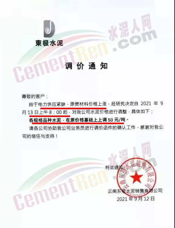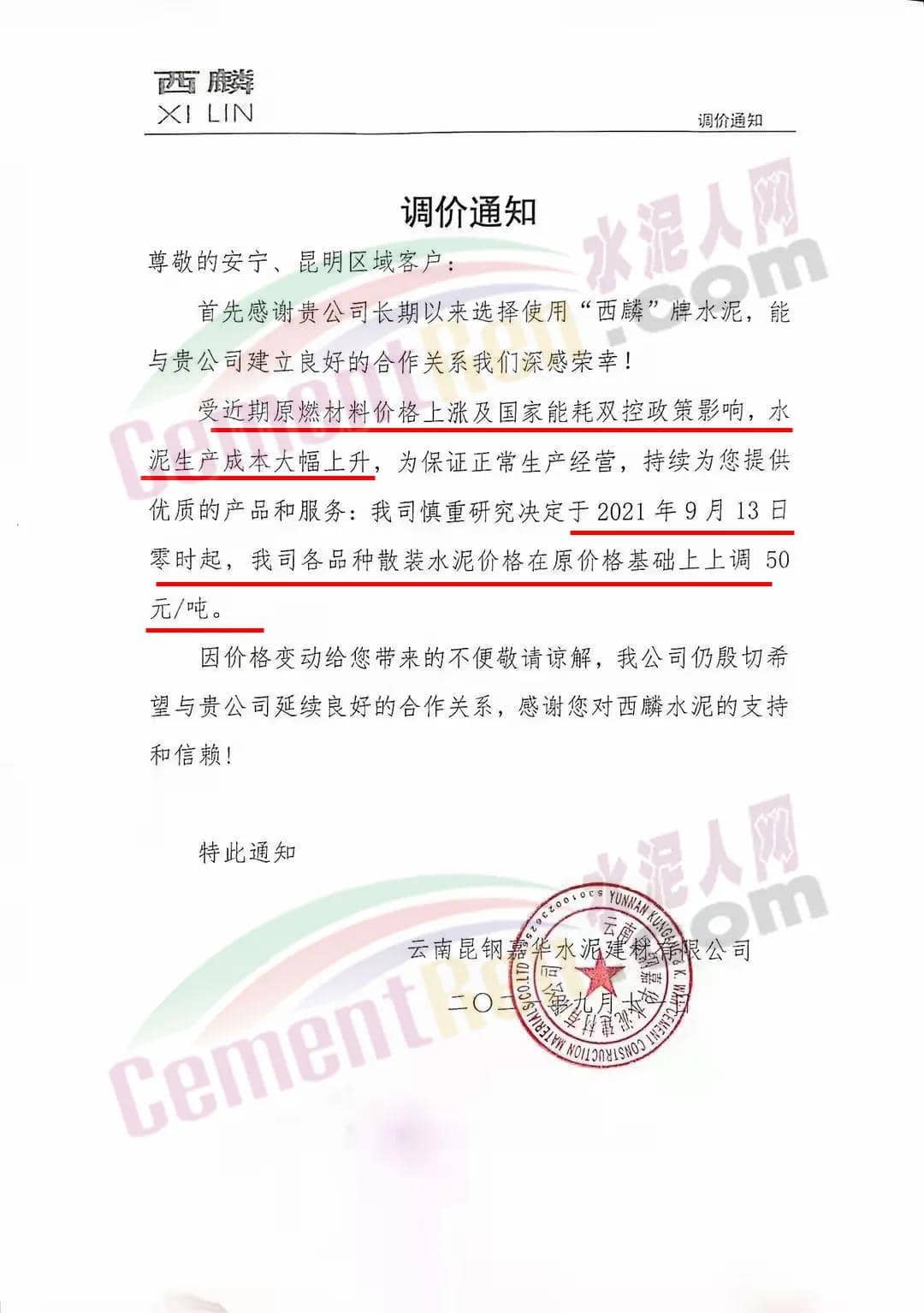 云南昆鋼嘉華水泥建材有限公司通知受近期原燃材料價(jià)格上漲及國(guó)家能耗雙控政策影響,水泥生產(chǎn)成本大幅上升,為保證正常生產(chǎn)經(jīng)營(yíng),決定于2021年9月13 日零時(shí)起,公司各品種散裝水泥價(jià)格在原價(jià)格基礎(chǔ)上上調(diào)50元/噸。