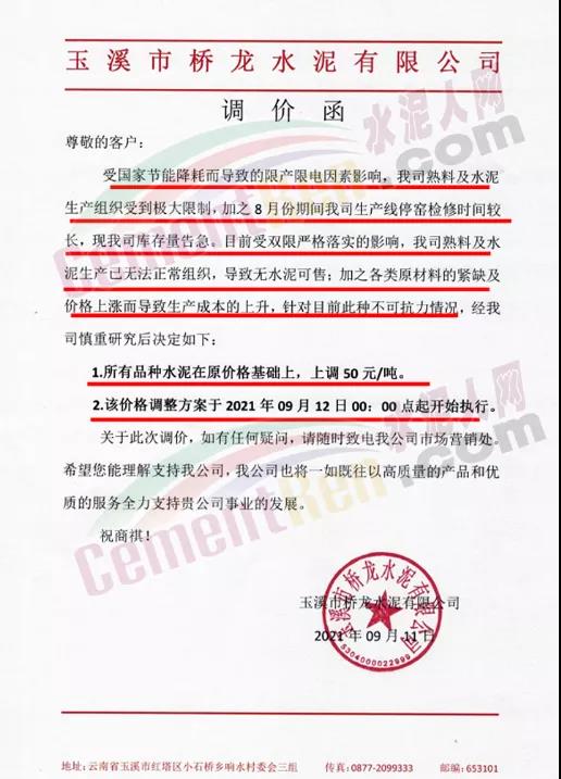 玉溪市橋龍水泥有限公司通知,受國(guó)家節(jié)能降耗而導(dǎo)致的限產(chǎn)限電因素影響,公司熟料及水泥生產(chǎn)組織受到極大限制,加之8月份期間公司生產(chǎn)線停窯檢修時(shí)間較長(zhǎng),現(xiàn)公司庫(kù)存量告急。目前受雙限嚴(yán)格落實(shí)的影響,公司熟料及水泥生產(chǎn)已無法正常組織,導(dǎo)致無水泥可售;加之各類原材料的緊缺及價(jià)格上漲而導(dǎo)致生產(chǎn)成本的上升,針對(duì)目前此種不可抗力情況,公司于2021年9月12日0點(diǎn)起開始上調(diào)所有品種水泥價(jià)格50元/噸。