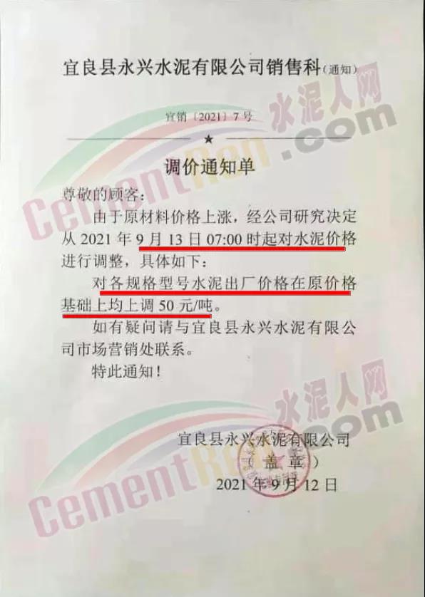宜良縣永興水泥有限公司通知,自9月13日7時(shí)起,對(duì)各規(guī)格型號(hào)水泥出廠價(jià)上調(diào)50元/噸。