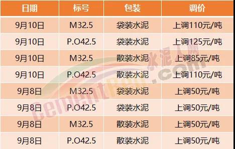 9月7日重慶綦江西南水泥、長(zhǎng)壽西南水泥、臺(tái)泥重慶公司等9家企業(yè)通知由于原材料成本增加,所有區(qū)域所有品牌水泥價(jià)格在原執(zhí)行價(jià)格基礎(chǔ)上上調(diào)50元/噸。