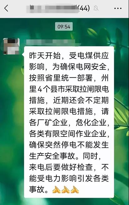 受電煤供應(yīng)影響,為確保電網(wǎng)安全,按照省里統(tǒng)一部署,州里4個(gè)縣市采取拉閘限電措施,近期還會(huì)不定期采取拉閘限電措施,請(qǐng)各廠礦企業(yè)、?;髽I(yè)、各類有限空間作業(yè)企業(yè),確保突發(fā)停電不能發(fā)生生產(chǎn)安全事故。