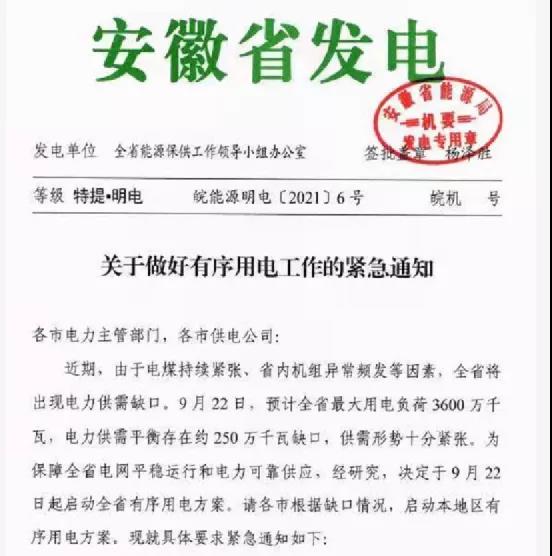 近日,安徽全省能源保供工作領(lǐng)導(dǎo)小組辦公室發(fā)布《關(guān)于做好有序用電的緊急通知》。其中提到,近期由于電煤持續(xù)緊張,省內(nèi)機(jī)組異常頻繁等因素,全省將出現(xiàn)電力供需缺口,9月22日預(yù)計(jì)全省最大用電負(fù)荷3600萬千瓦,電力供需平衡存在約250萬千萬缺口,供需形勢(shì)十分緊張。為保障全省電網(wǎng)平穩(wěn)運(yùn)行和電力可靠供應(yīng),經(jīng)研究,決定于9月22日起啟動(dòng)全省有序用電方案。