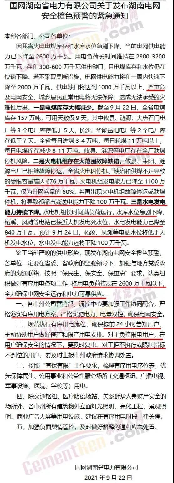因電力供應(yīng)緊張,江蘇、浙江、山東、廣東等在內(nèi)的至少10多個(gè)省份陸續(xù)發(fā)布“限電停產(chǎn)”通知。廣東、江蘇、浙江、山東、安徽都是水泥大省,也是像海螺、華潤、南方、山水、中聯(lián)等水泥集團(tuán)的重點(diǎn)區(qū)域,而此輪大規(guī)模的停限產(chǎn)勢(shì)必會(huì)造成水泥企業(yè)的大規(guī)模停限產(chǎn)預(yù)警。