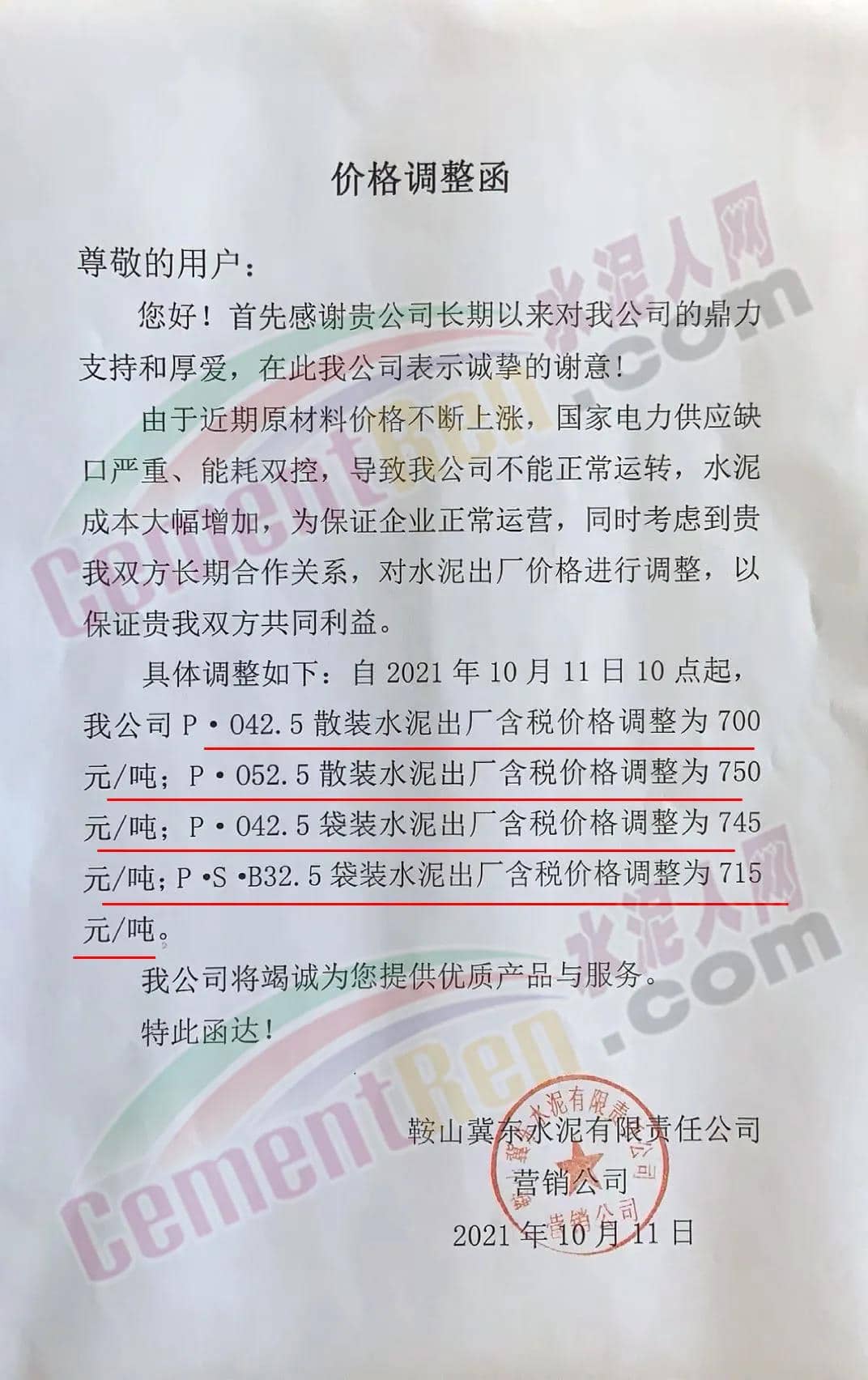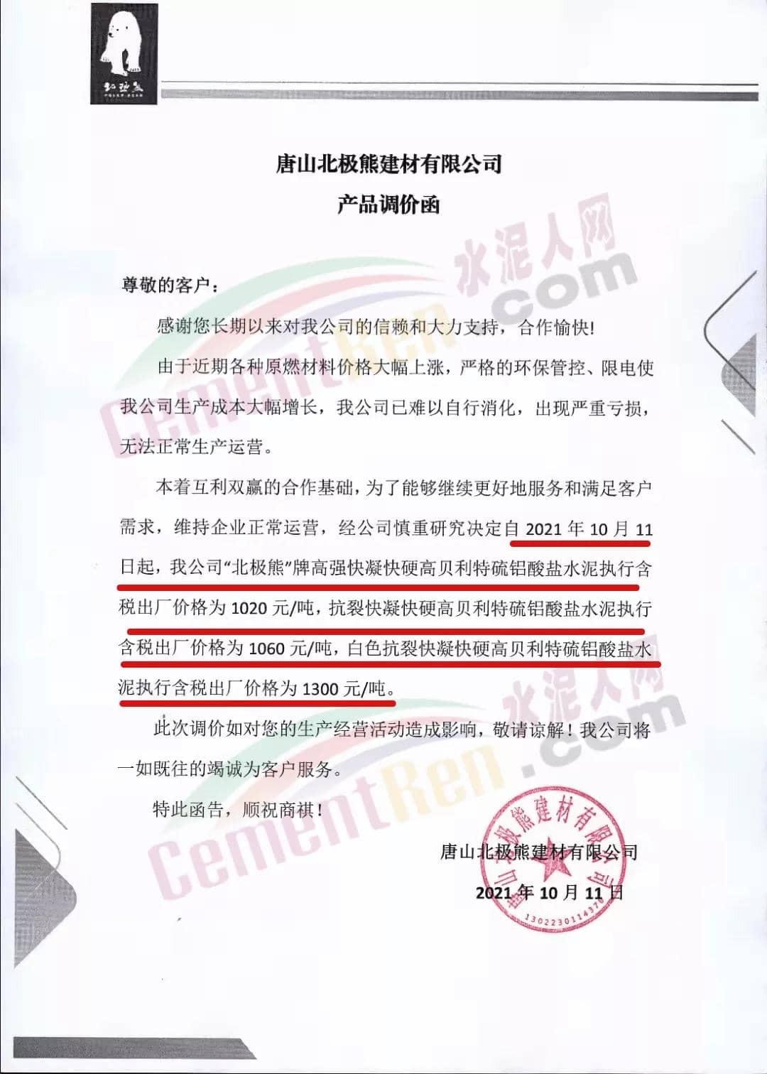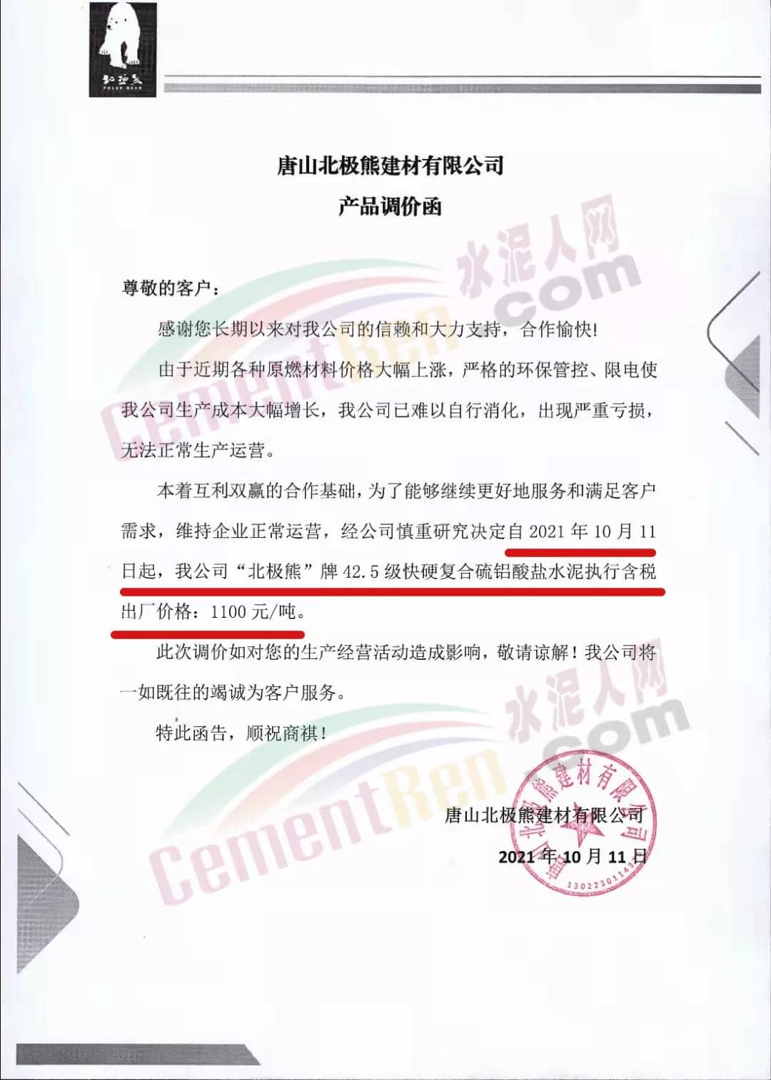 10月11日唐山北極熊建材有限公司發(fā)布通知稱:本著互利雙贏的合作基礎(chǔ),為了能夠繼續(xù)更好地服務(wù)和滿足客戶需求,維持企業(yè)正常運營,經(jīng)公司慎重研究決定自2021年10月11日起,調(diào)整產(chǎn)品價格。調(diào)價后旗下“北極熊”品牌水泥價格最高達1300元/噸。