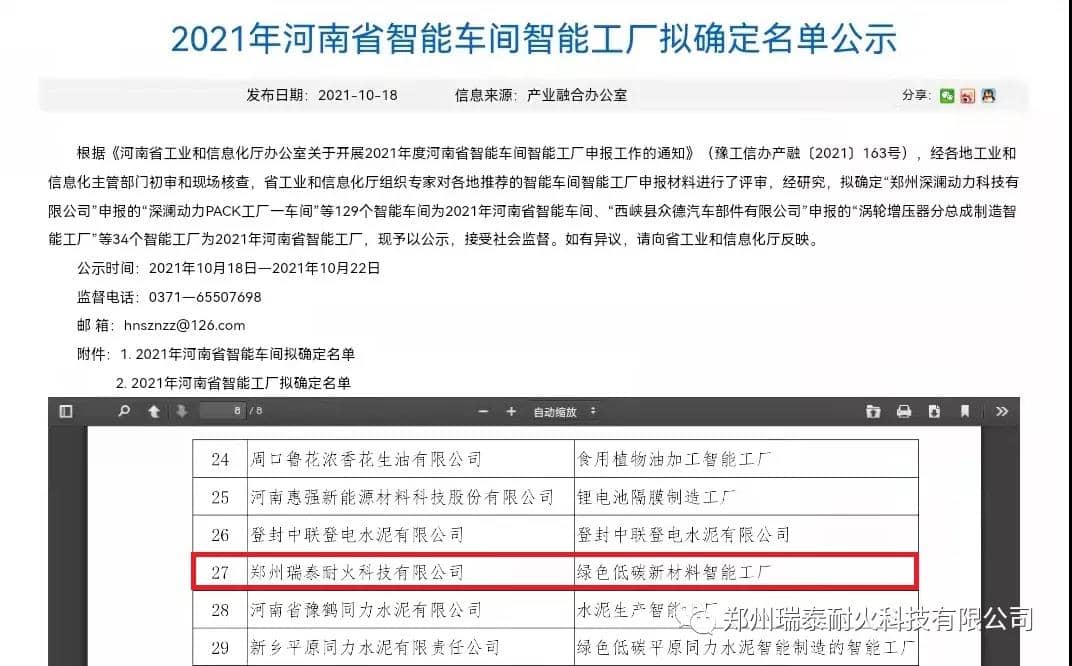 10月18日,河南省工業(yè)和信息化廳發(fā)布了2021年河南省“智能工廠”評審結果名單,鄭州瑞泰耐火科技有限公司通過認定,標志著鄭州瑞泰智能生產制造邁上了新臺階,實現(xiàn)了新突破。