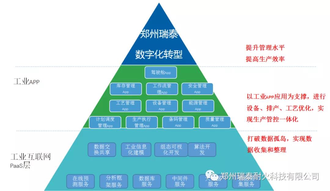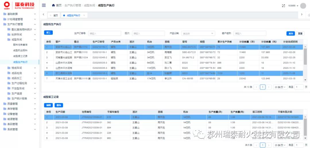 目前,鄭州瑞泰實現(xiàn)了耐火材料制造過程中的全部數(shù)字化管理與控制,包括生產計劃、作業(yè)派工、庫存等管理以及設備聯(lián)網、數(shù)據自動實時采集、工業(yè)大數(shù)據分析和現(xiàn)場看板化展示等。在生產過程中,從粉碎、配料、成型、燒成、檢測、包裝流程全面實現(xiàn)自動化、數(shù)字化、網絡化、智能化。
