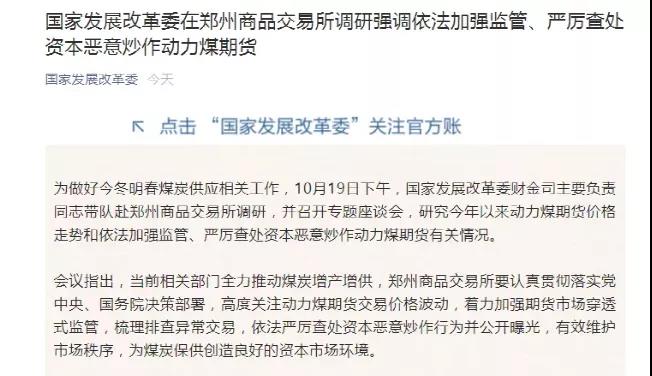 據(jù)了解,10月19日下午,國家發(fā)展改革委財金司主要負(fù)責(zé)同志帶隊赴鄭州商品交易所調(diào)研,并召開專題座談會,研究今年以來動力煤期貨價格走勢和依法加強(qiáng)監(jiān)管、嚴(yán)厲查處資本惡意炒作動力煤期貨有關(guān)情況。