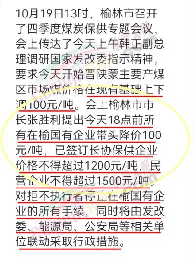 10月19日13時,榆林市召開了四季度煤炭保供專題會議,會上傳達(dá)了當(dāng)日上午韓正副總理調(diào)研國家發(fā)改委指示精神,要求晉陜蒙主要產(chǎn)煤區(qū)市場煤價格在現(xiàn)有基礎(chǔ)上下調(diào)100元/噸。會上榆林市市長張勝利提出19日18點(diǎn)前所有在榆國有企業(yè)帶頭降價100元/噸,已簽訂長協(xié)保供企業(yè)價格不得超過1200元/噸,民營企業(yè)不得超過1500元/噸。對拒不執(zhí)行者停止在榆國有企業(yè)的所有手續(xù),同時將由發(fā)改委、能源局、公安局等相關(guān)單位聯(lián)動采取行政措施。