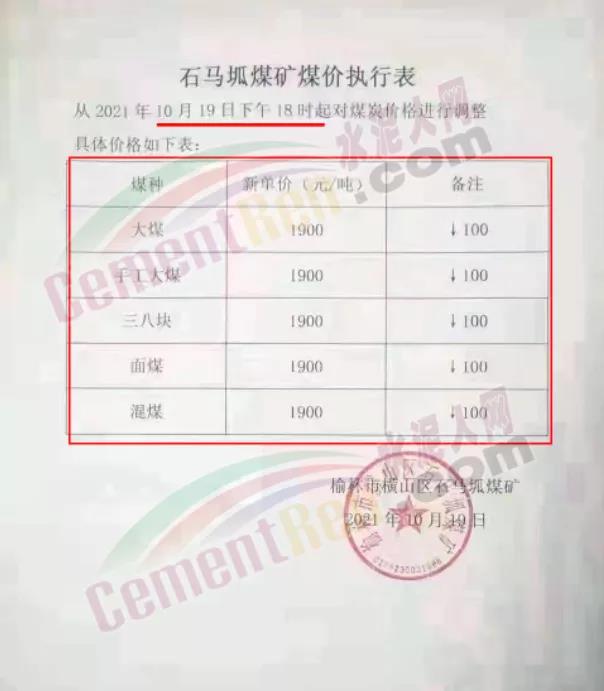當(dāng)日,榆林市橫山區(qū)石馬坬煤礦通知從2021年10月19日下午18時起對煤炭價格下調(diào)100元/噸,新單報價1900元/噸。