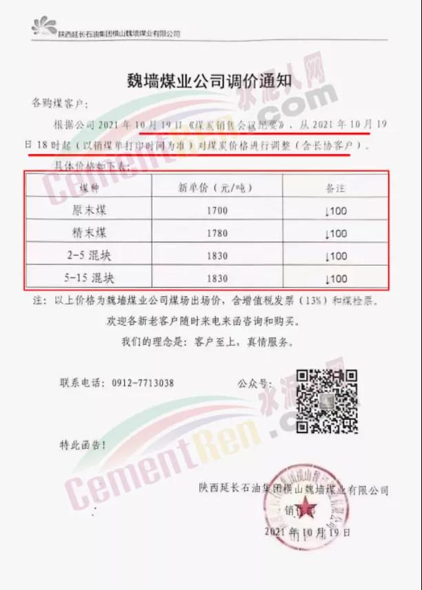 陜西延長石油集團(tuán)橫山魏墻煤業(yè)有限公司通知根據(jù)公司2021年10月19日《煤炭銷售會議紀(jì)要》,從10月19日18時起對煤炭價格下調(diào)100元/噸。煤價下調(diào)后報價1700-1830元/噸。