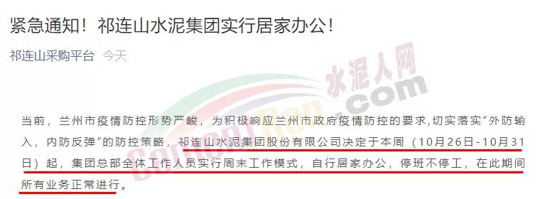 日前,祁連山水泥集團發(fā)緊急通知稱,當前蘭州市疫情防控形勢嚴峻,為積極響應(yīng)蘭州市政府疫情防控的要求,切實落實“外防輸入,內(nèi)防反彈”的防控策略,祁連山水泥集團股份有限公司決定于10月26日-10月31日起,集團總部全體工作人員實行周末工作模式,自行居家辦公,停班不停工,在此期間所有業(yè)務(wù)正常進行。
