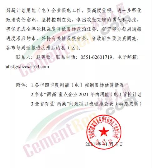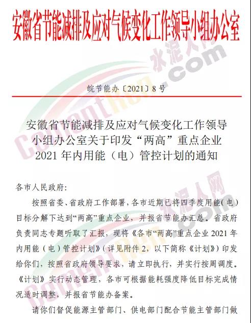 日前,安徽省節(jié)能減排及應(yīng)對氣候變化工作領(lǐng)導(dǎo)小組辦公室發(fā)布《安徽省節(jié)能減排及應(yīng)對氣候變化工作領(lǐng)導(dǎo)小組辦公室關(guān)于印發(fā)“兩高”重點企業(yè)2021年內(nèi)用能(電)管控計劃的通知》要求各市人民政府督促能源主管部門、供電部門配合節(jié)能主管部門做好超計劃用能(電)企業(yè)限電工作。