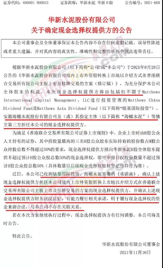 11月9日晚間,華新水泥發(fā)布公告稱,根據(jù)華新水泥股份有限公司于2021年8月28日公告的《華新水泥股份有限公司境內(nèi)上市外資股轉(zhuǎn)換上市地以介紹方式在香港聯(lián)合交易所有限公司主板上市及掛牌交易的方案(修訂稿)》,為充分保護(hù)本公司全體股東的利益,本次現(xiàn)金選擇權(quán)提供方將由包括但不限于銘基國(guó)際投資、海螺水泥等獨(dú)立第三方擔(dān)任本公司的現(xiàn)金選擇權(quán)提供方。