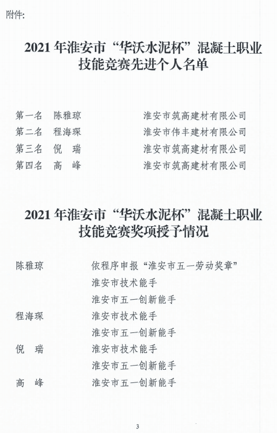 其中,來自淮安市筑高建材有限公司的陳雅瓊,取得個人總成績第一名,將依程序申報“淮安市五一勞動獎?wù)?rdquo;;個人總成績前三名選手陳雅瓊、程海琛、倪瑞授予“淮安市技術(shù)能手”稱號;個人總成績前四名選手陳雅瓊、程海琛、倪瑞、高峰授予“淮安市五一創(chuàng)新能手”稱號。