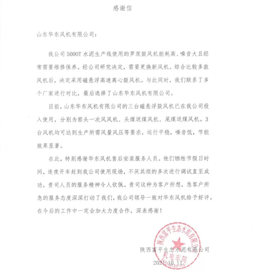憑借專業(yè)的技術(shù)團隊、現(xiàn)代化的加工設(shè)備、完善的售后服務(wù),華東風(fēng)機幫助富平生態(tài)水泥在提高能源利用效率、降低企業(yè)綜合能耗等方面取得了突破性的進步,為此,富平生態(tài)水泥特向華東風(fēng)機寄來了感謝信。