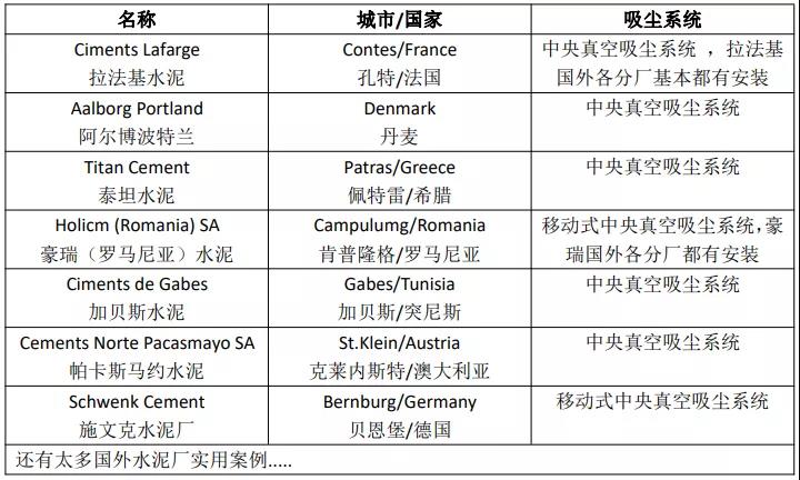 據水泥人網了解,在世界范圍內,目前最有效、最高效的粉塵清潔方式,采用純吸的方式(純吸無揚塵,無二次污染),可高效快速的吸走粉塵,一次徹底清掃,杜絕二次污染,一套系統(tǒng)可抵多套普通吸塵器,可降低企業(yè)生產成本,提高生產效率,減少人力物力,實現清潔生產。該套系統(tǒng)在國外水泥廠各車間都是標配設備,為此小編特意查閱了世界水泥工廠使用案例,真是不勝枚舉,在此先簡單羅列幾個。