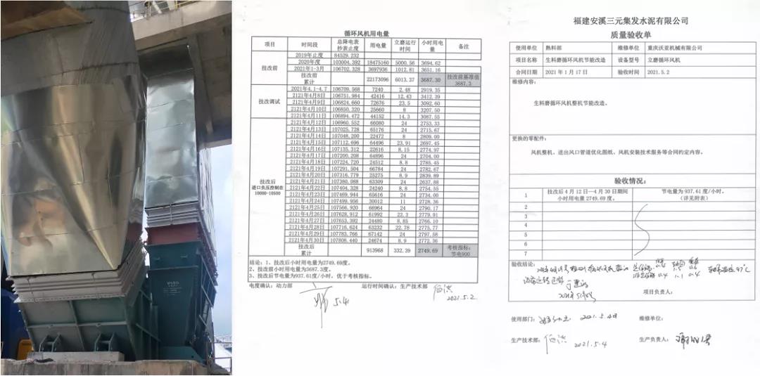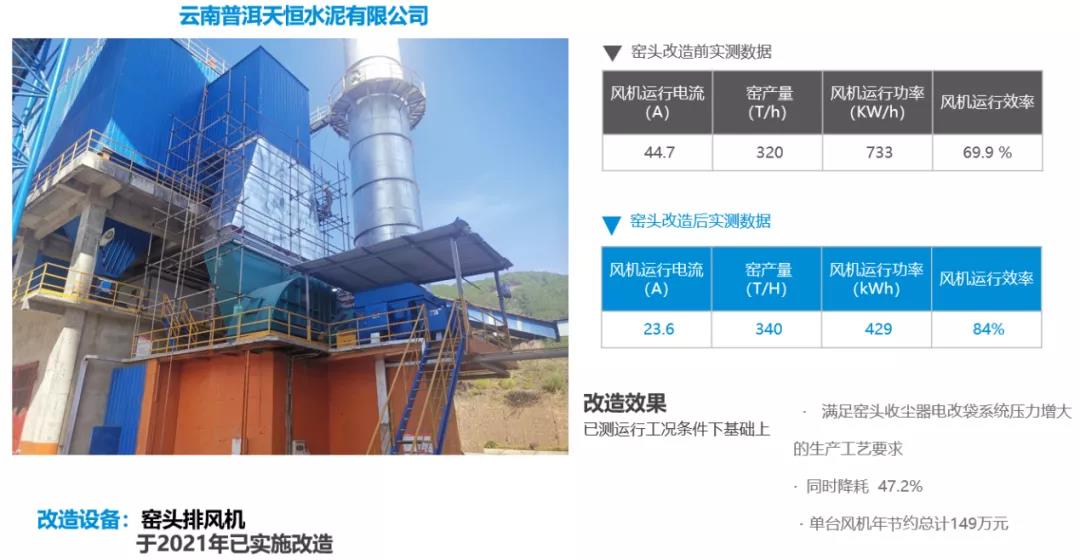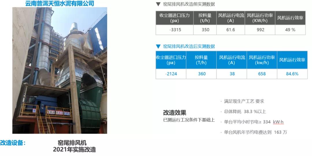該項(xiàng)目于2021年實(shí)施改造,生料磨循環(huán)風(fēng)機(jī)改造后同比運(yùn)行功率下降937kW。