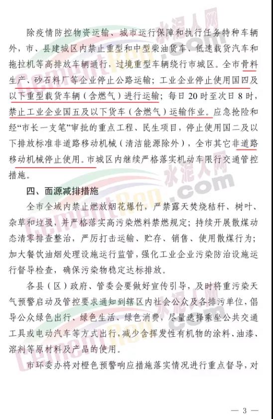 除應(yīng)急搶險外,施工工地、工業(yè)企業(yè)廠區(qū)和工業(yè)園區(qū)內(nèi)非道路移動機(jī)械停止使用。礦山、沙石料廠、石材廠、石板廠停止生產(chǎn)、運(yùn)輸。除應(yīng)急搶險外,全市施工工地停止土石方、建筑拆除、噴涂粉刷、護(hù)坡噴漿作業(yè)。