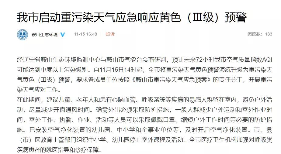 經(jīng)預(yù)測,受不利氣象條件影響,11月15日20時以后,我市可能出現(xiàn)大氣持續(xù)重污染過程。為做好防范應(yīng)對工作,經(jīng)中國環(huán)科院大氣所專家組研究并報市政府同意,決定發(fā)布重污染天氣黃色預(yù)警,并于11月15日20時起全市啟動Ⅲ級應(yīng)急響應(yīng)。重污染天氣預(yù)警解除時間另行通知。現(xiàn)將應(yīng)急響應(yīng)措施公告如下: