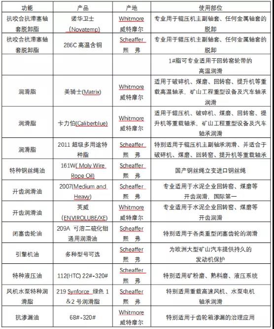 顯著的節(jié)能降耗效果,使得whitmore 美騎士潤滑脂被該水泥企業(yè)廣泛推廣于其企業(yè)粉磨、煤磨、回轉(zhuǎn)窯、破碎機、斗提等各關健潤滑部位使用,較大的減少了企業(yè)生產(chǎn)成本。另:whitmore、Schaeffer 兩款國際頂級尖端重工業(yè)潤滑系列產(chǎn)品有各種特性,幾十種的特殊產(chǎn)品可針對不同運轉(zhuǎn)狀況進行優(yōu)秀潤滑。