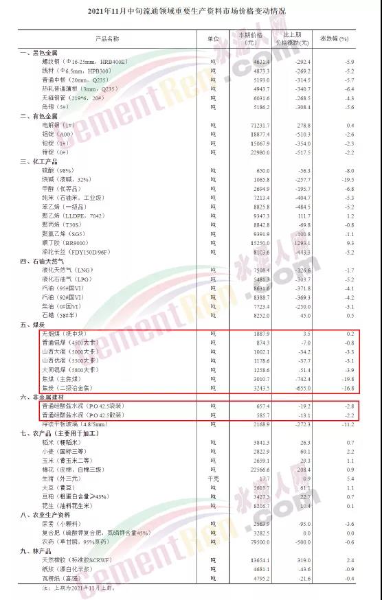日前,國家統(tǒng)計局發(fā)布《2021年11月中旬流通領(lǐng)域重要生產(chǎn)資料市場價格變動情況,據(jù)對全國流通領(lǐng)域9大類50種重要生產(chǎn)資料市場價格的監(jiān)測顯示,2021年11月中旬與11月上旬相比,14種產(chǎn)品價格上漲,35種下降,1種持平。其中,普通硅酸鹽水泥(P.O42.5散裝)均價585.7元/噸,較十一月上旬下跌13.1元/噸;普通硅酸鹽水泥(P.O42.5袋裝)報價657.4元,較上旬下跌19.2元/噸。