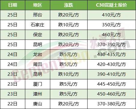 近期河北、福建、云南等多區(qū)域混凝土價格持續(xù)下跌,河北邢臺、石家莊、保定、唐山跌20元/方,C30混凝土報價350-410元/方。