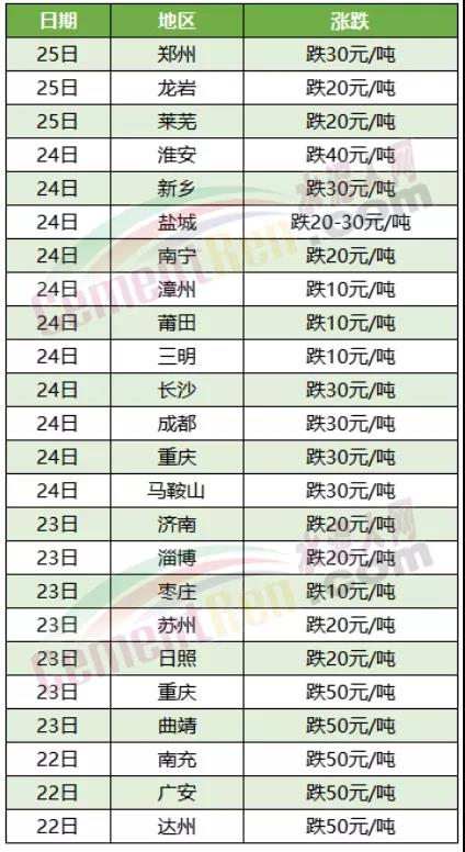 川渝地區(qū)大氣污染防控,環(huán)保管制加嚴(yán),加上一些項目因資金緊張,水泥市場需求低迷。各企業(yè)庫存高位運行。同時遭遇外來低價水泥沖擊,競爭加劇。區(qū)域主要品牌企業(yè)陸續(xù)通知下調(diào)水泥價格,其中重慶、達州、廣安、南充以及云南曲靖等多地水泥價格跌50-80元/噸。重慶區(qū)域23、24日連續(xù)兩次下調(diào)水泥價格,累計下跌50-80元/噸,絕大多數(shù)企業(yè)下調(diào)金額在20-30元/噸之間。