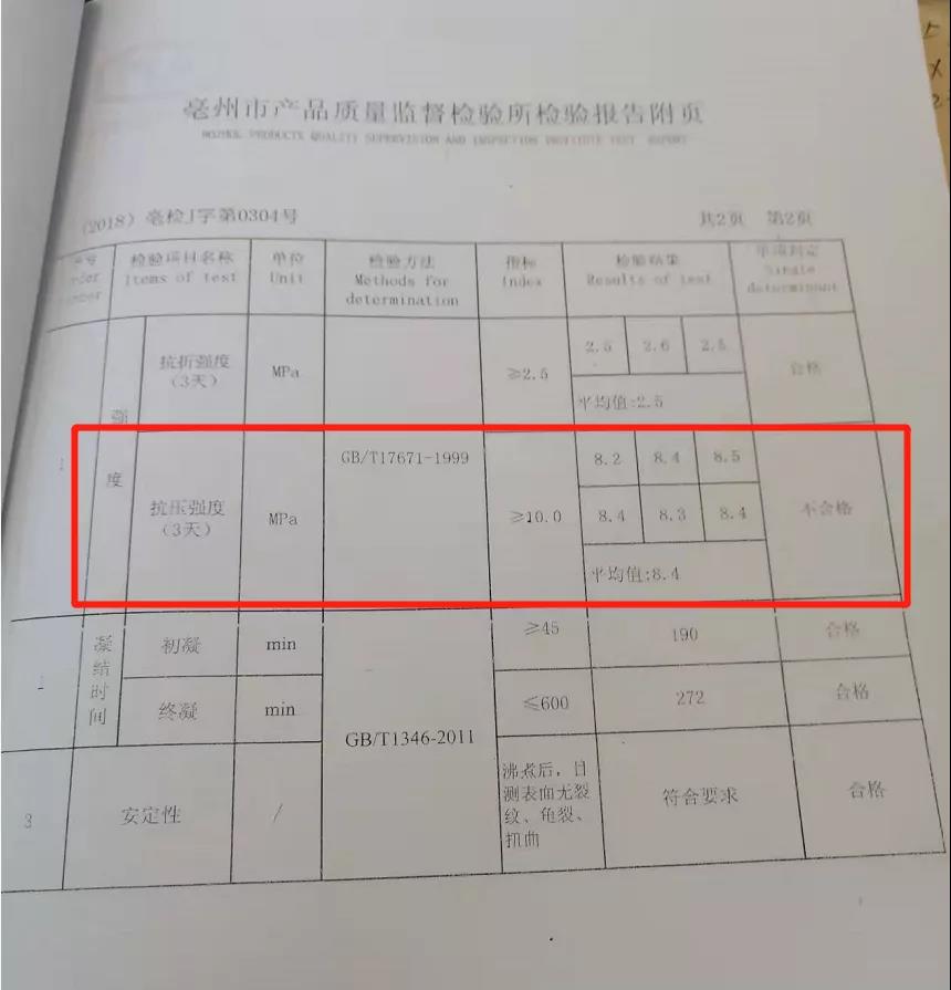 在此期間,消費(fèi)者通過(guò)質(zhì)量監(jiān)督檢測(cè)部門檢測(cè),確認(rèn)水泥質(zhì)量不合格。檢驗(yàn)報(bào)告如下: