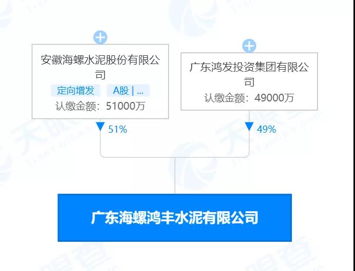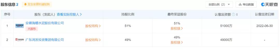 2021年11月26日廣東海螺鴻豐水泥有限公司成立,注冊資本10億人民幣。企業(yè)股東信息顯示,安徽海螺水泥作為合資企業(yè)大股東,持股51%,認繳出資額為51000萬,認繳出資日期為2022年6月30日;廣東鴻發(fā)投資集團有限公司持股49%,認繳出資額49000萬。