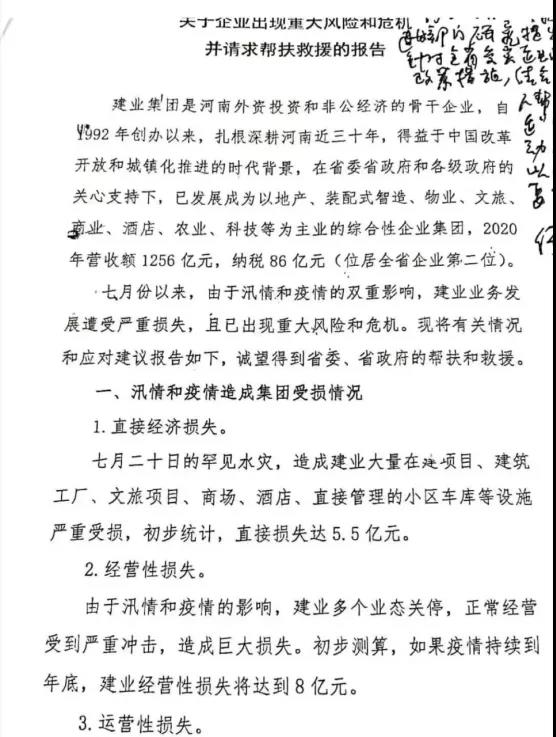 不久前,一封有關(guān)河南王建業(yè)的求助信在網(wǎng)絡(luò)上流傳。這封題為《關(guān)于企業(yè)出現(xiàn)重大風(fēng)險(xiǎn)和危機(jī)并請(qǐng)求幫扶救援的報(bào)告》的“求助信”稱:如果建業(yè)被汛情疫情拖累,過不去眼前這個(gè)坎,有可能成為全國(guó)企業(yè)“爆雷”和倒下的“下一個(gè)”,其消極反響將是全國(guó)性的、極為嚴(yán)重的。因?yàn)檫@封信,“建業(yè)系”四家上市公司(建業(yè)地產(chǎn)、筑友智造科技、中原建業(yè)、建業(yè)新生活)股價(jià)齊齊下跌。為此,建業(yè)集團(tuán)迅速召開線上媒體溝通會(huì),總裁王俊出面回應(yīng)稱,“求助信”內(nèi)容真實(shí)。