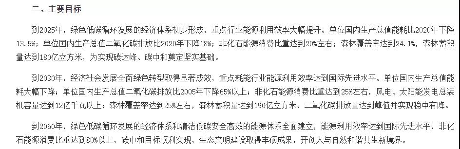 日前,中共中央、國務(wù)院印發(fā)的《關(guān)于完整準確全面貫徹新發(fā)展理念做好碳達峰碳中和工作的意見》正式發(fā)布,《意見》提出到2025年,綠色低碳循環(huán)發(fā)展的經(jīng)濟體系初步形成,重點行業(yè)能源利用效率大幅提升;到2030年,經(jīng)濟社會發(fā)展全面綠色轉(zhuǎn)型取得顯著成效,重點耗能行業(yè)能源利用效率達到國際先進水平;到2060年,綠色低碳循環(huán)發(fā)展的經(jīng)濟體系和清潔低碳安全高效的能源體系全面建立,能源利用效率達到國際先進水平的主要目標。