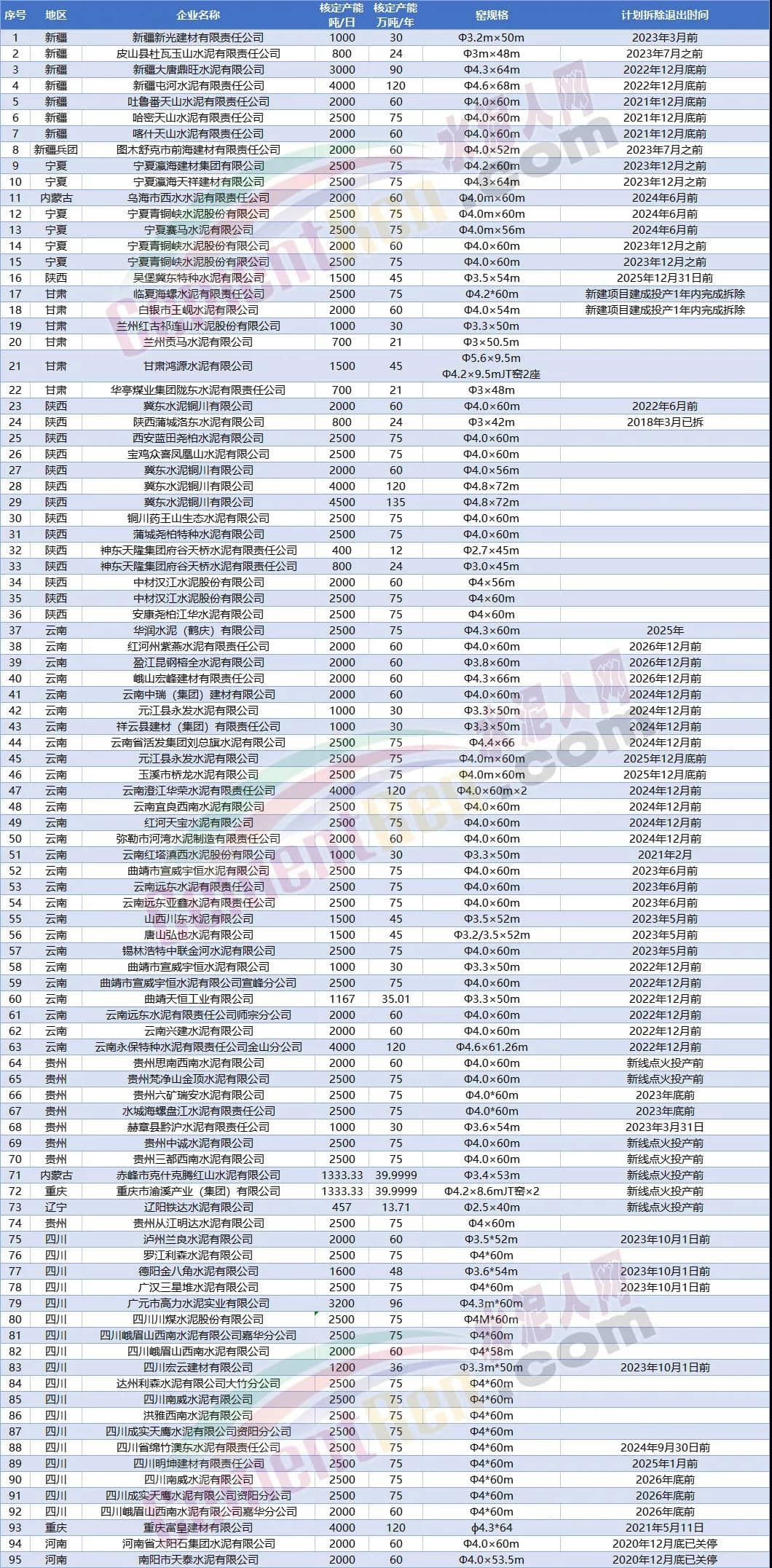 同時(shí),有大量的智能化高產(chǎn)水泥生產(chǎn)線陸續(xù)建成投產(chǎn)。據(jù)不完全統(tǒng)計(jì)從2021年至2025年底前將有37條5340.9萬(wàn)噸/年。新型干法水泥熟料生產(chǎn)線點(diǎn)火投產(chǎn)。擬于2021年12月-2025年12月期間點(diǎn)火投產(chǎn)部分生產(chǎn)線如下:
