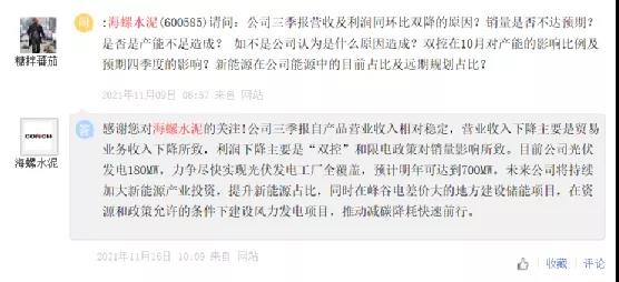 此前海螺水泥表示,公司三季報(bào)利潤下降主要是“雙控”和限電政策對銷量影響所致。目前公司光伏發(fā)電180MW,力爭盡快實(shí)現(xiàn)光伏發(fā)電工廠全覆蓋,預(yù)計(jì)明年可達(dá)到700MW,未來公司將持續(xù)加大新能源產(chǎn)業(yè)投資,提升新能源占比,同時在峰谷電差價大的地方建設(shè)儲能項(xiàng)目,在資源和政策允許的條件下建設(shè)風(fēng)力發(fā)電項(xiàng)目,推動減碳降耗快速前行。