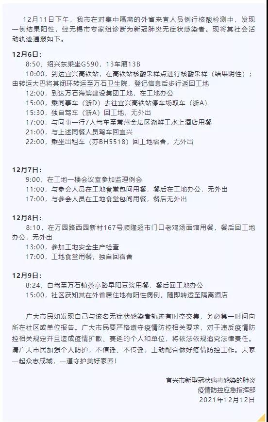 日前 ,江蘇宜興市通報(bào)發(fā)現(xiàn)一例新冠肺炎無(wú)癥狀感染者。通報(bào)顯示,該感染者6日從浙江紹興到宜興,期間在萬(wàn)石海濱建設(shè)集團(tuán)工地等區(qū)域活動(dòng),從其活動(dòng)軌跡可見(jiàn),該感染者曾參加監(jiān)理例會(huì)和工地安全生產(chǎn)檢查。經(jīng)排查,密切接觸者共63人,次密切接觸者共560人。全部集中隔離并規(guī)范開(kāi)展核酸檢測(cè),已出結(jié)果均為陰性。