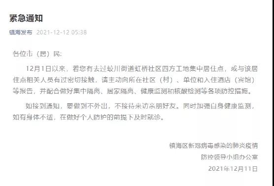 繼江蘇宜興之后,浙江寧波同一工地13人確診。浙江寧波鎮(zhèn)海區(qū)發(fā)布緊急通知,要求自12月1日以來(lái),有去過(guò)蛟川街道虹橋社區(qū)四方工地集中居住點(diǎn),或與該居住點(diǎn)相關(guān)人員有過(guò)密切接角的人員主動(dòng)向所在社區(qū)(村)、單位和入住酒店(賓館)等報(bào)告 。