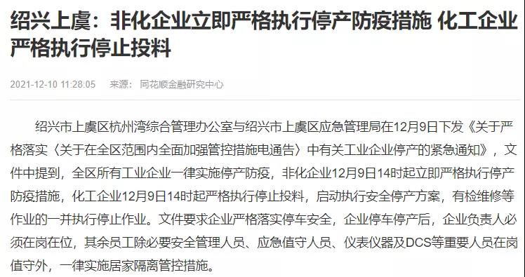 全區(qū)所有工業(yè)企業(yè)一律實(shí)施停產(chǎn)防疫,非化企業(yè)12月9日14時(shí)起立即嚴(yán)格執(zhí)行停產(chǎn)防疫措施,化工企業(yè)12月9日14時(shí)起嚴(yán)格執(zhí)行停止投料,啟動(dòng)執(zhí)行安全停產(chǎn)方案,有檢維修等作業(yè)的一并執(zhí)行停止作業(yè)。