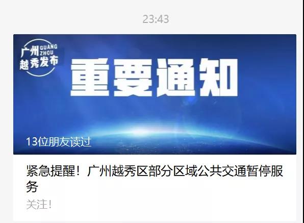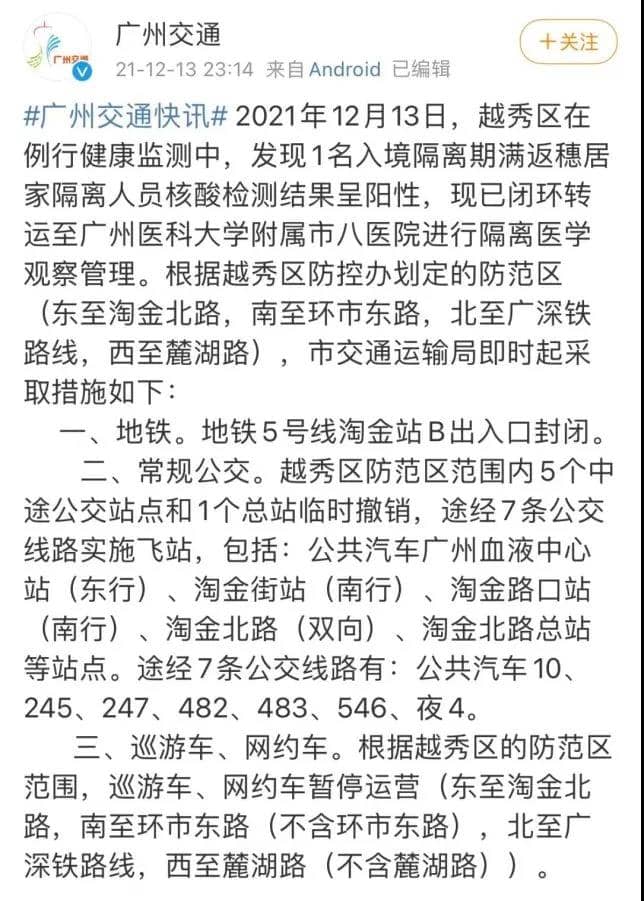廣州越秀區(qū)部分區(qū)域公共交通暫停服務(wù)。根據(jù)越秀區(qū)防控辦劃定的防范區(qū)(東至淘金北路,南至環(huán)市東路,北至廣深鐵路線(xiàn),西至麓湖路),廣州市交通運(yùn)輸局即時(shí)起采取措施如下: