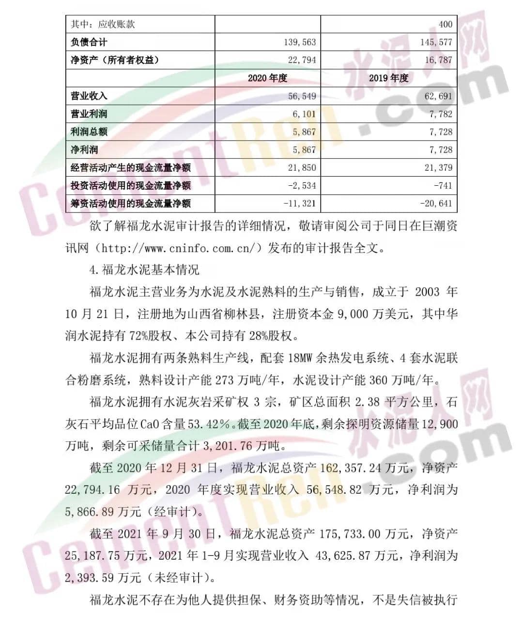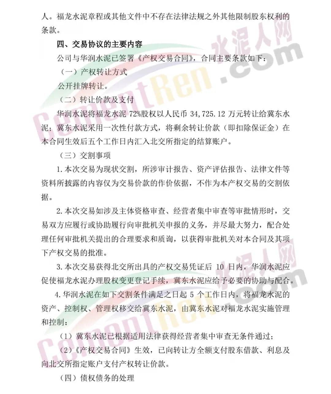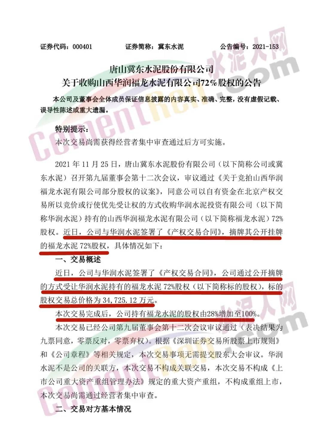 12月15日晚間,冀東水泥發(fā)布公告稱,近日,公司通過(guò)公開(kāi)摘牌的方式受讓華潤(rùn)水泥持有的福龍水泥72%股權(quán),標(biāo)的股權(quán)交易總價(jià)格為3.47億元。此次交易完成后,公司持有福龍水泥的股權(quán)由28%增加至100%。福龍水泥擁有完整的水泥熟料生產(chǎn)線,裝備和工藝水平比較先進(jìn),擁有資源品位較好的石灰石礦山,周邊輔材豐富,生產(chǎn)成本在區(qū)域處于領(lǐng)先水平。此次交易有利于公司優(yōu)化山西區(qū)域的產(chǎn)能結(jié)構(gòu)。